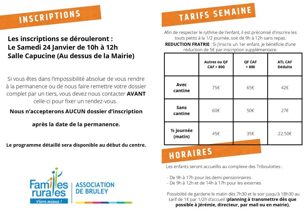 Nous vous invitons à contacter Jérémie THUILLIER, directeur de l'accueil, par mail à l'adresse jmairiebruley@orange.fr ou l'AFR Bruley à l'adresse afrbruley@yahoo.com